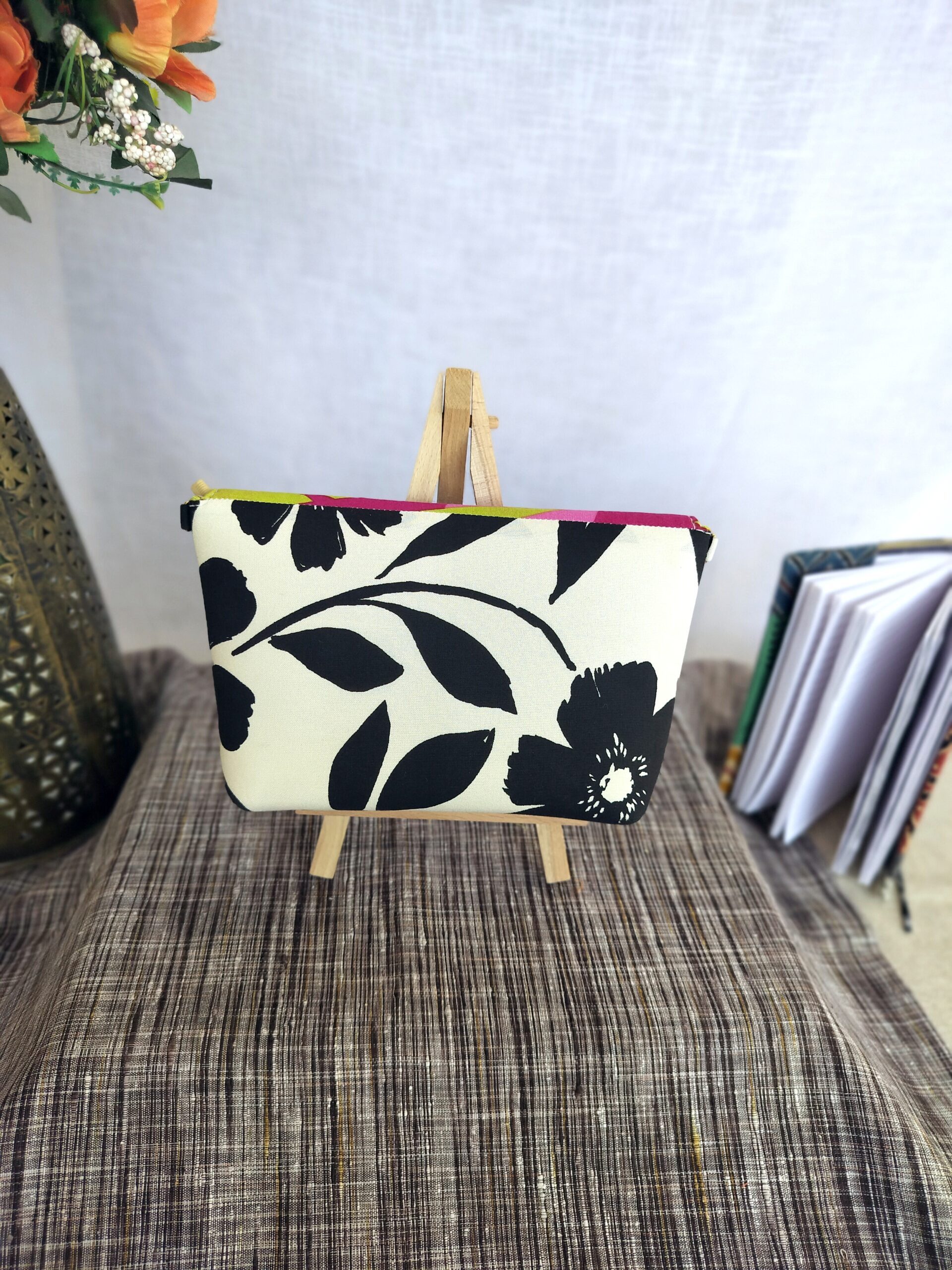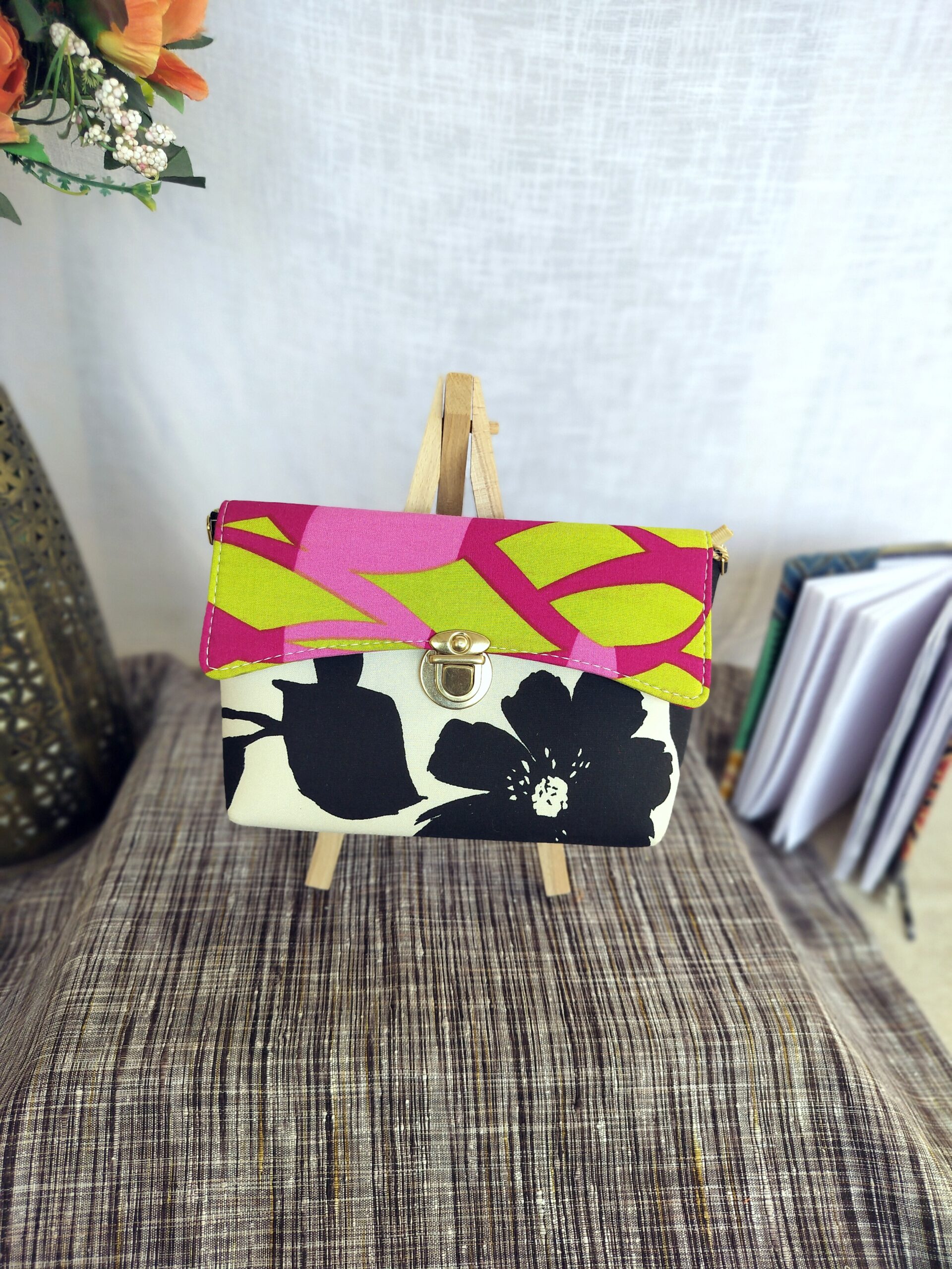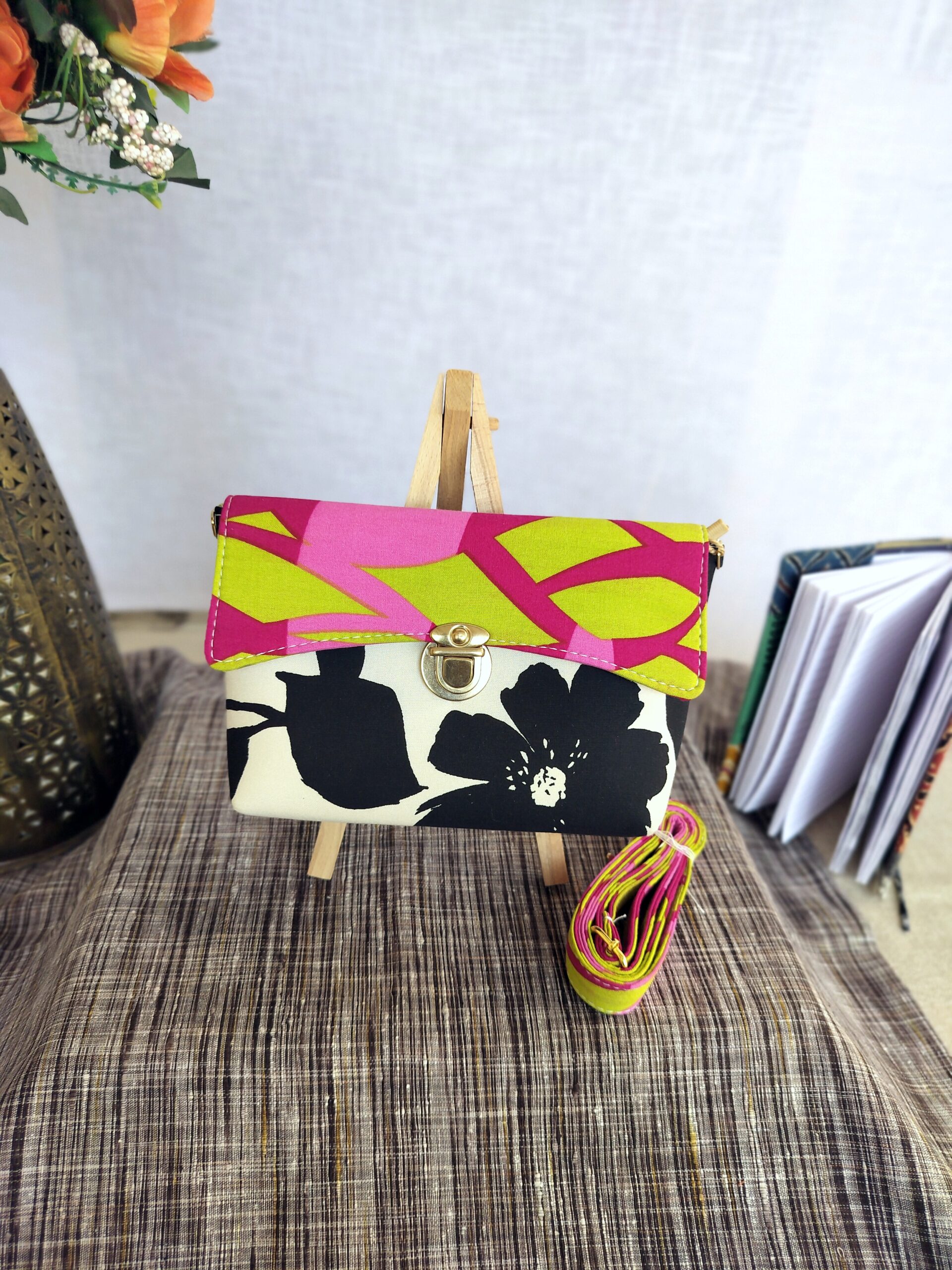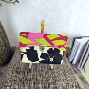 Add a pop of color to your look with this Black Floral Sling Bag. Crafted from upcycled fabric, this unique bag is both stylish and sustainable. It’s washable, features a zip inside, and comes with a adjustable sling and golden buckle. No leather used.