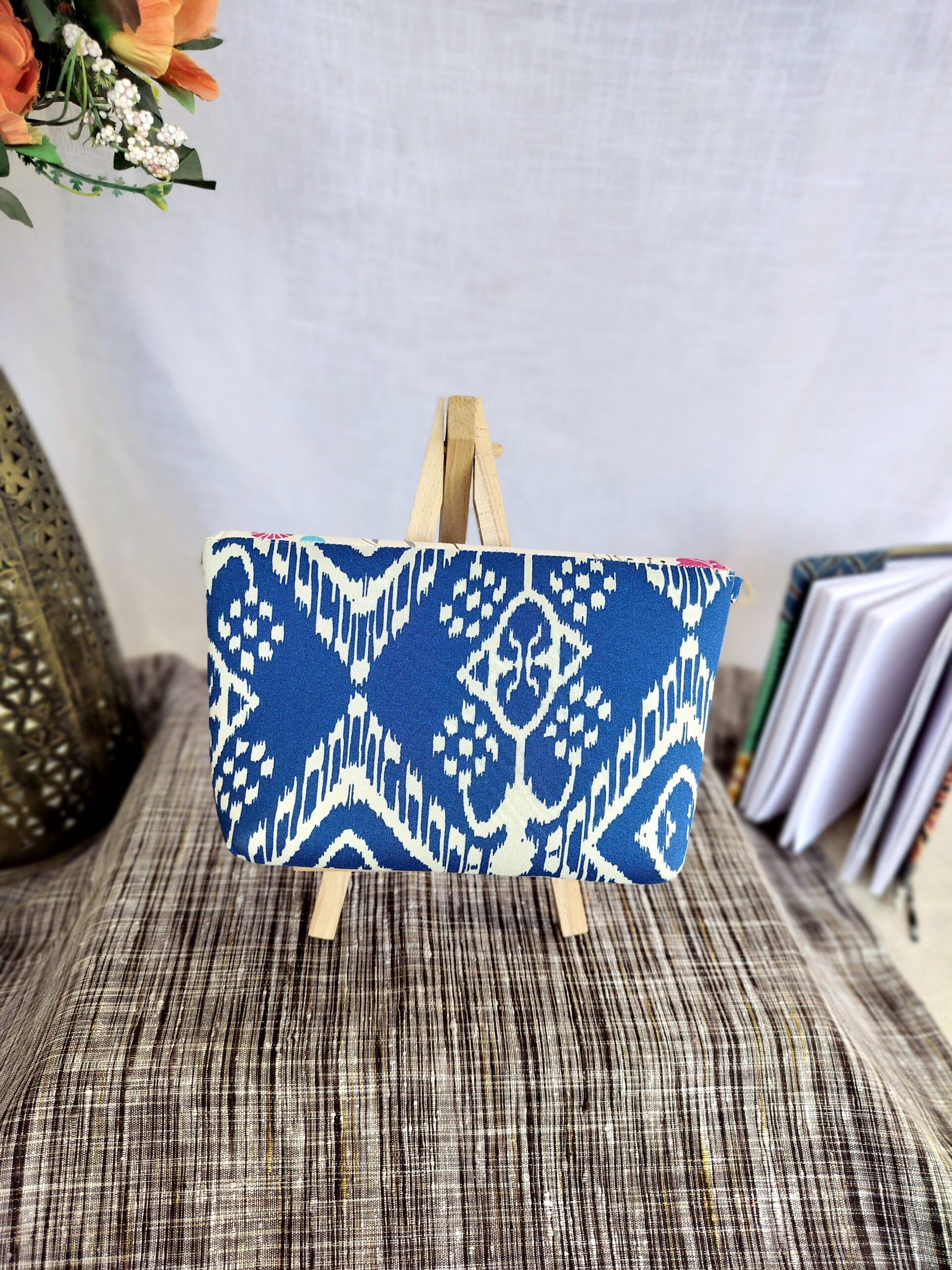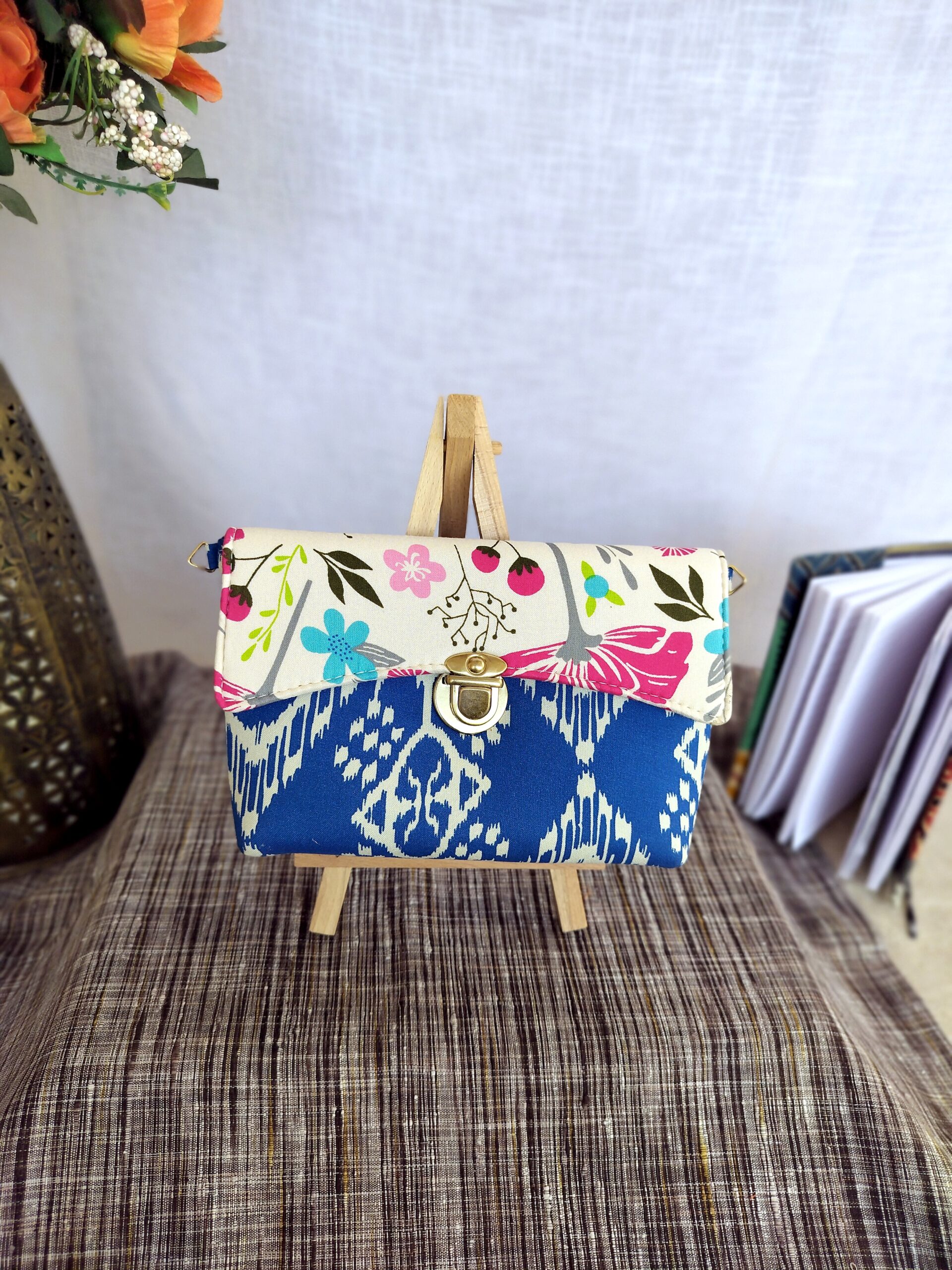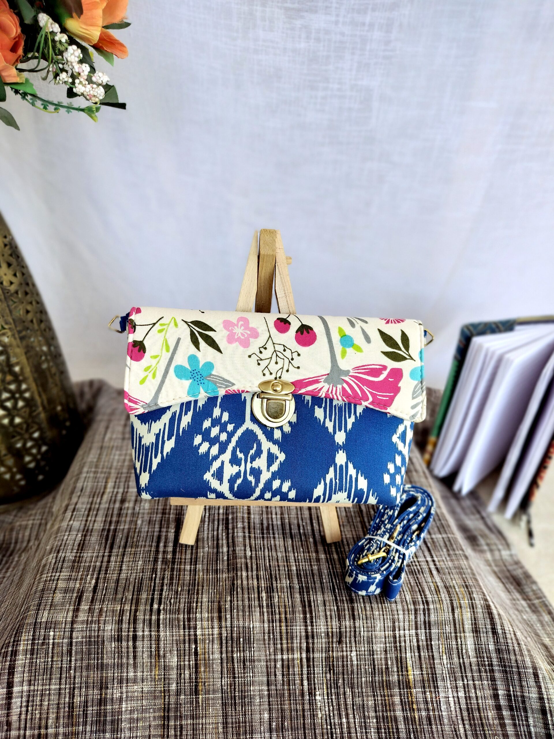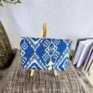 Add a pop of color to your look with this Dancing Ikat Sling Bag. Crafted from upcycled fabric, this unique bag is both stylish and sustainable. It’s washable, features a zip inside, and comes with a adjustable sling and golden buckle. No leather used.