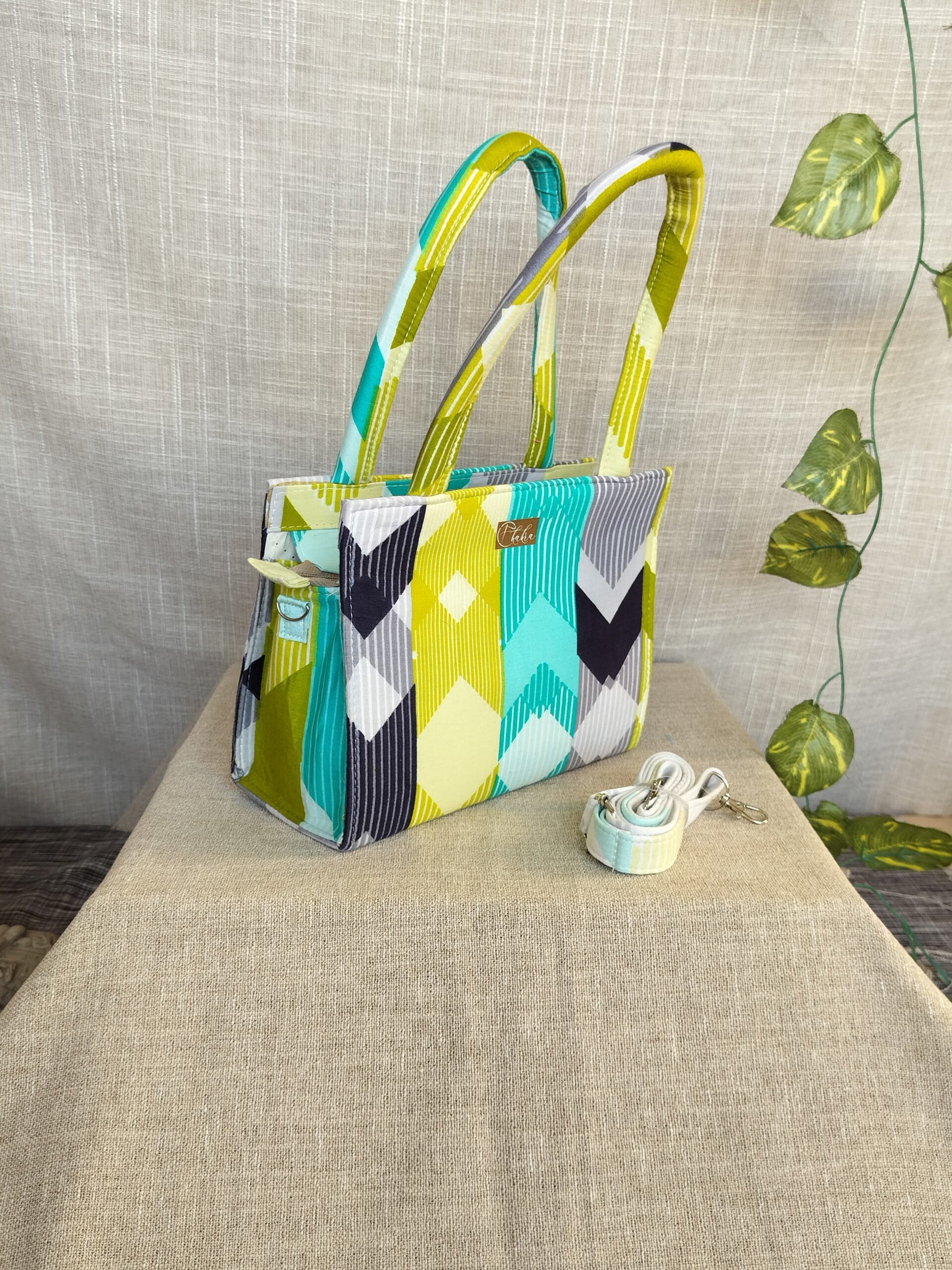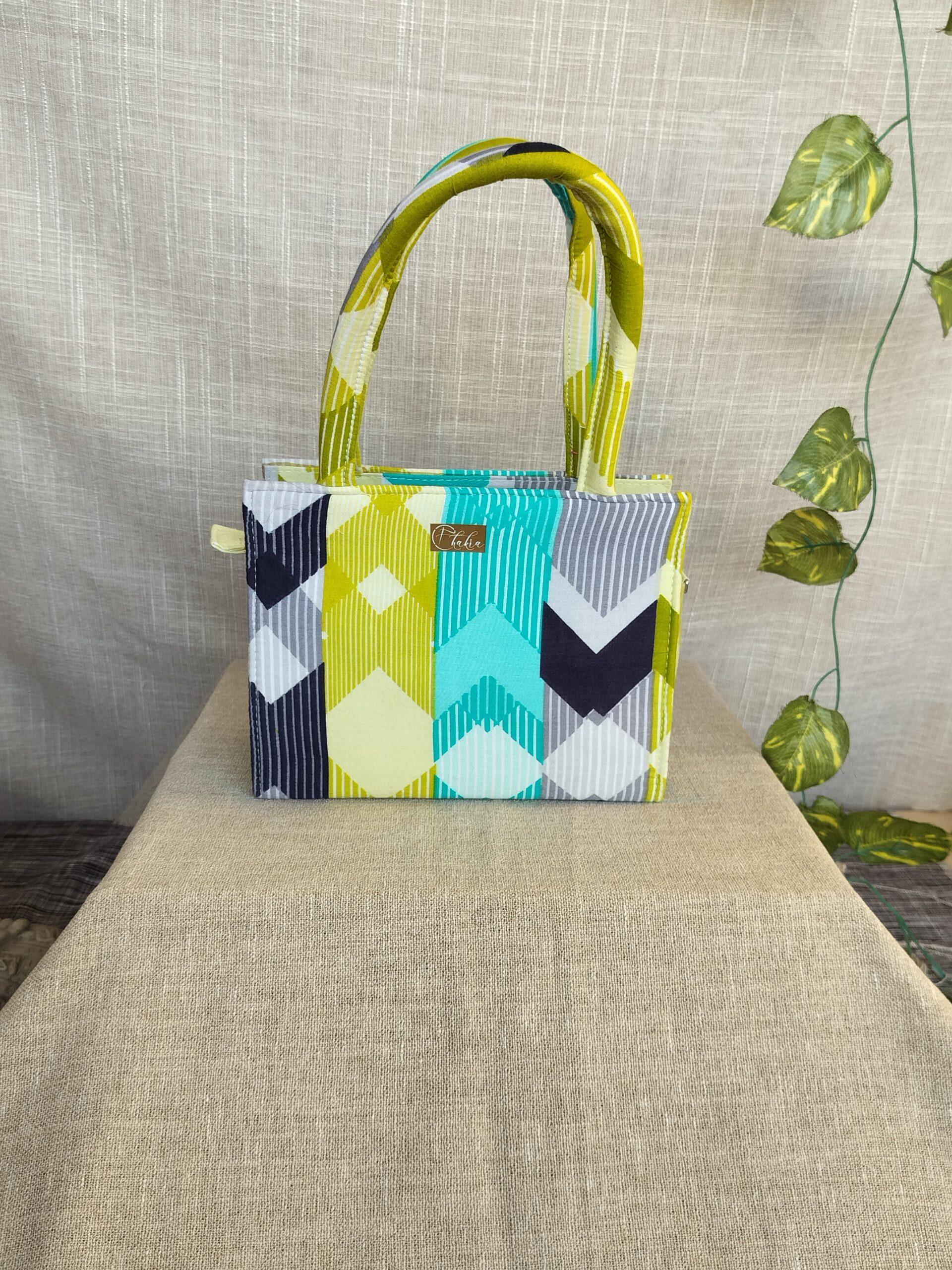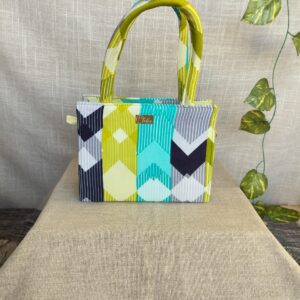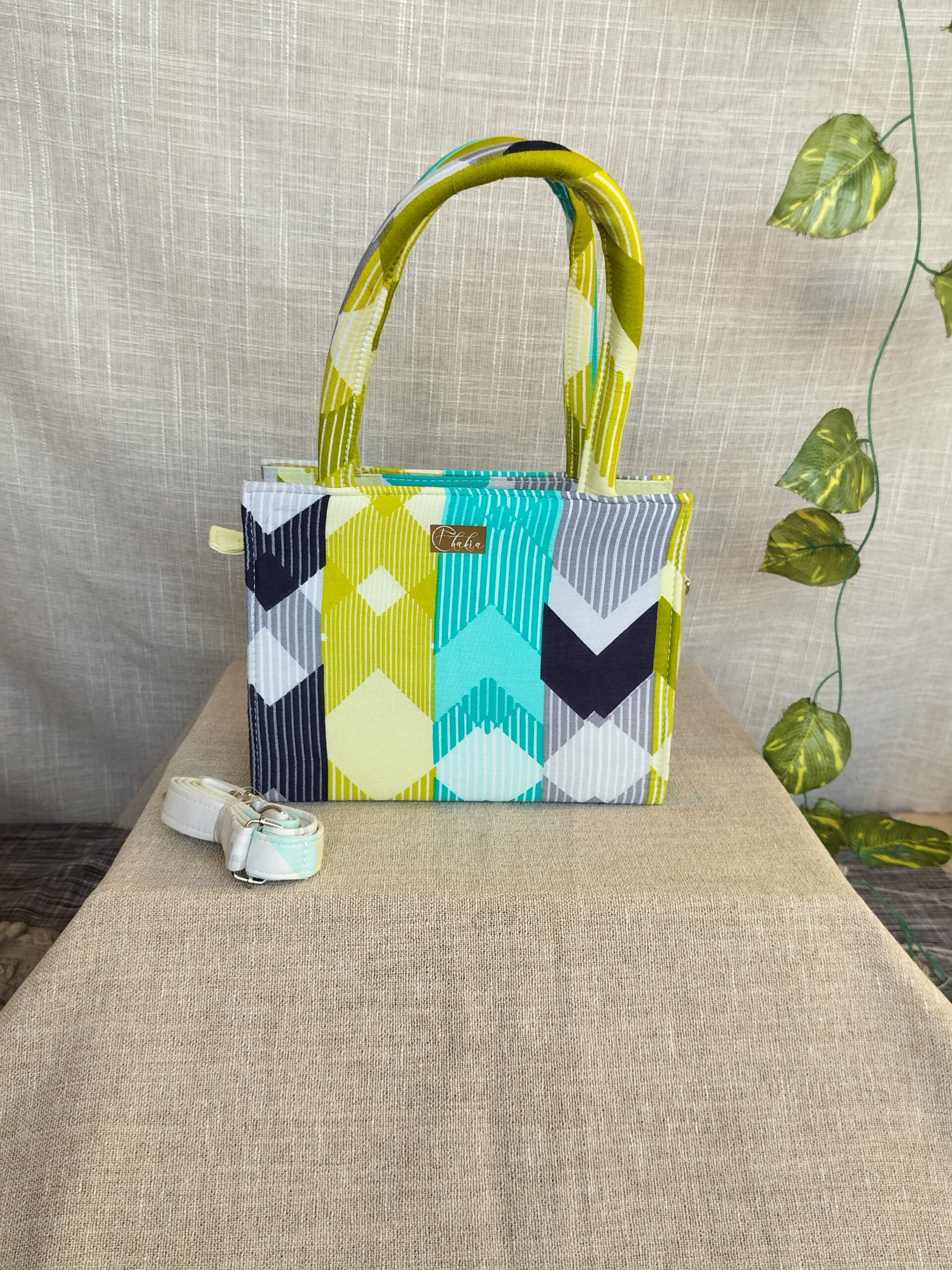 Handcrafted from upcycled materials, these sustainable Electric Tiny Tote Bags are not only unique with their geometric print but also washable. The neon color adds a pop of fun, while the sling bag design offers convenience. A fashionable and eco-friendly choice for any fashion expert.