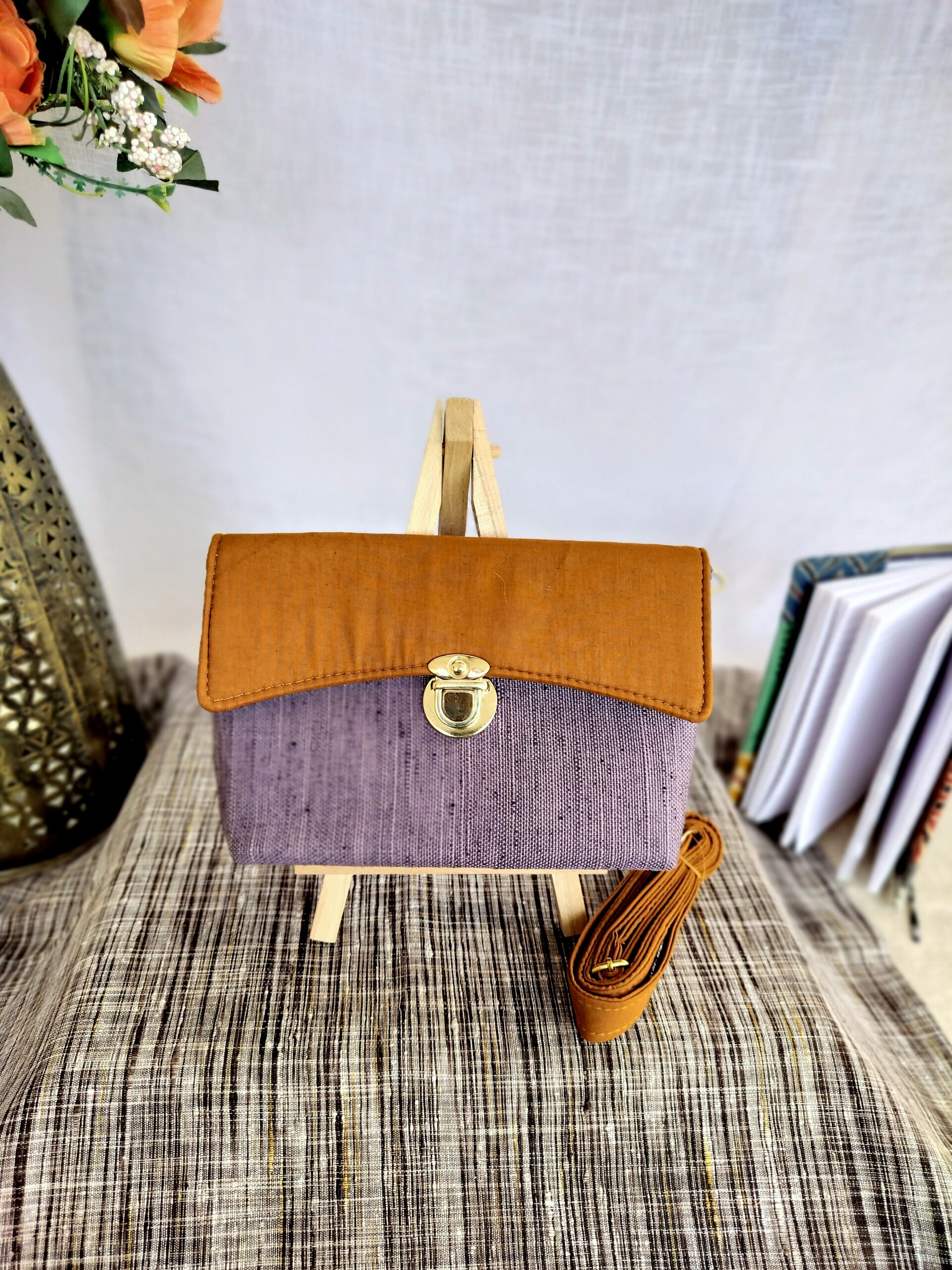 Add a pop of color to your look with this Mauve Sling Bag. Crafted from upcycled fabric, this unique bag is both stylish and sustainable. It’s washable, features a zip inside, and comes with a adjustable  sling and golden buckle. No leather used.