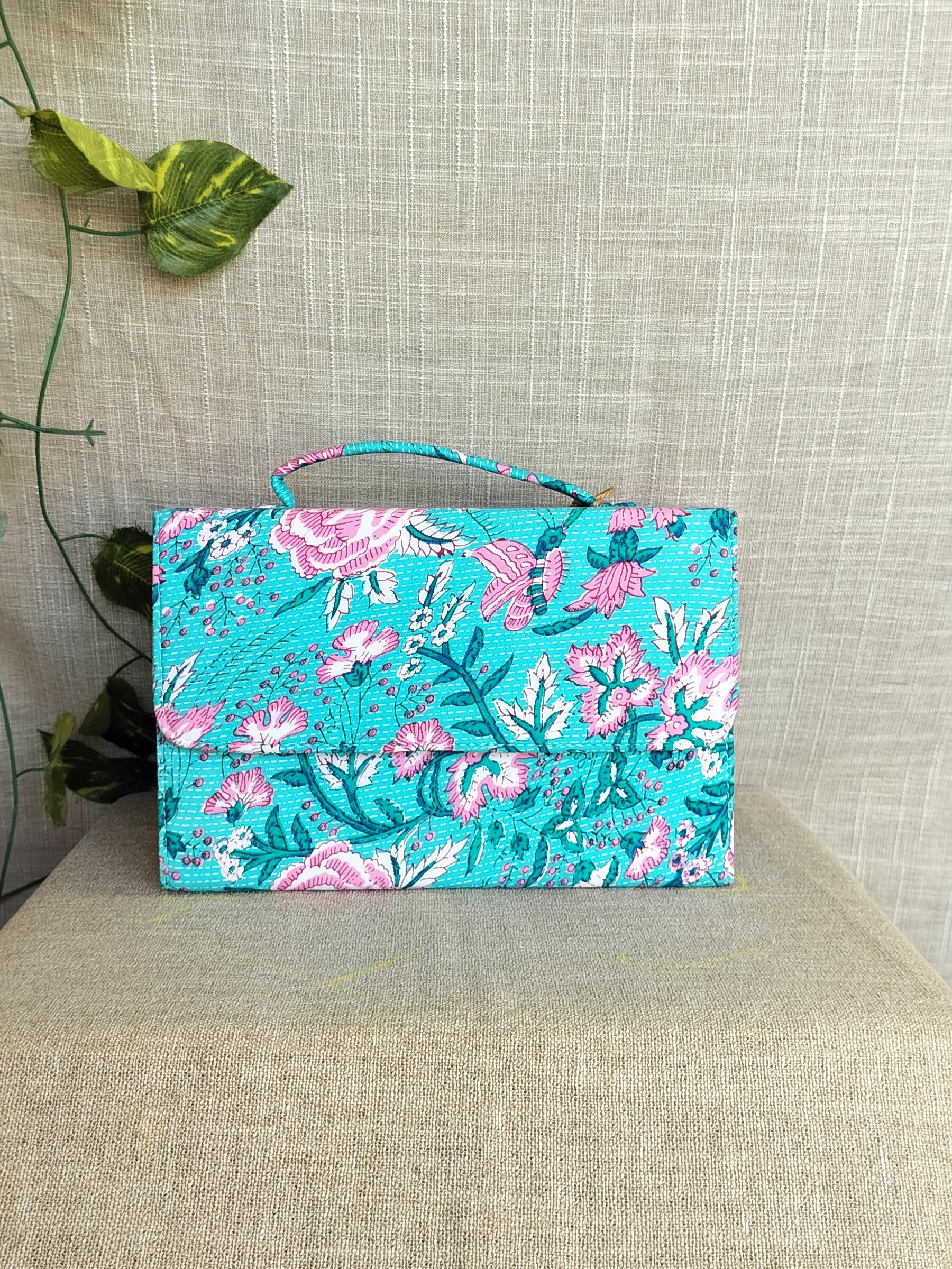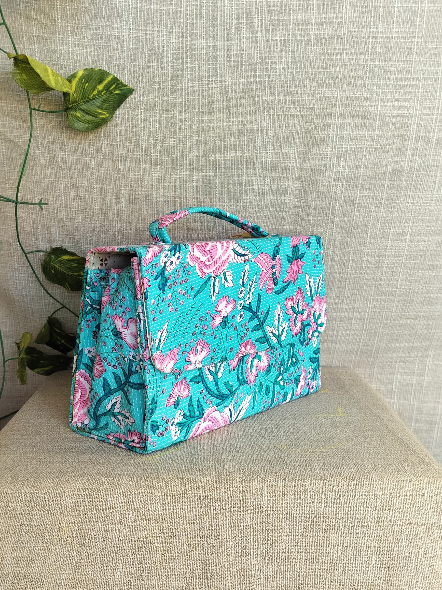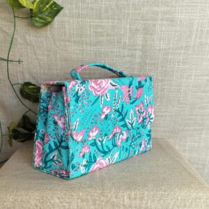 Introducing our handcrafted Peacock Box Sling Bag With Handles! Featuring a beautiful floral design, this bag is both unique and sustainable – made from upcycled materials and easily washable. With an added handle, it’s perfect for any festive occasion. Get a festive vibe while being eco-friendly!