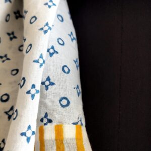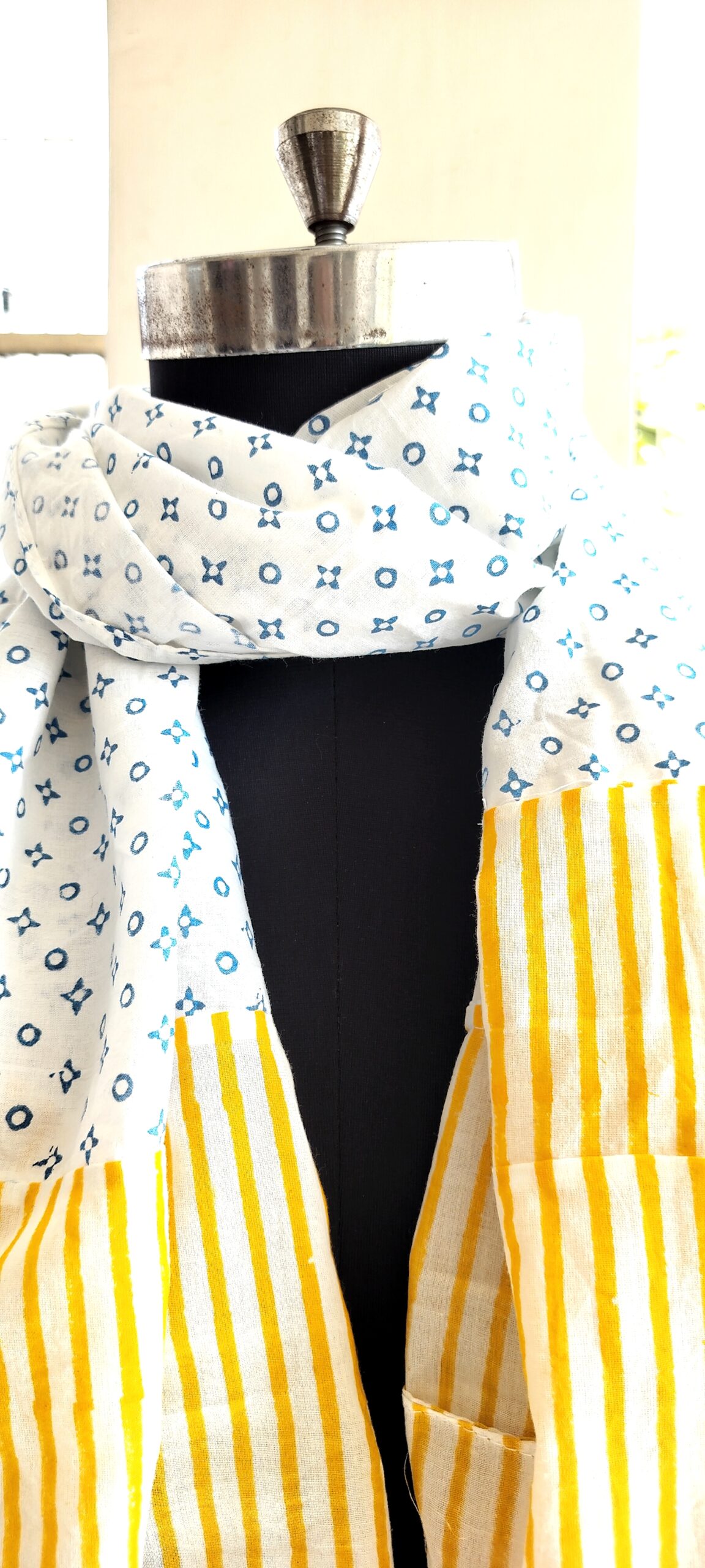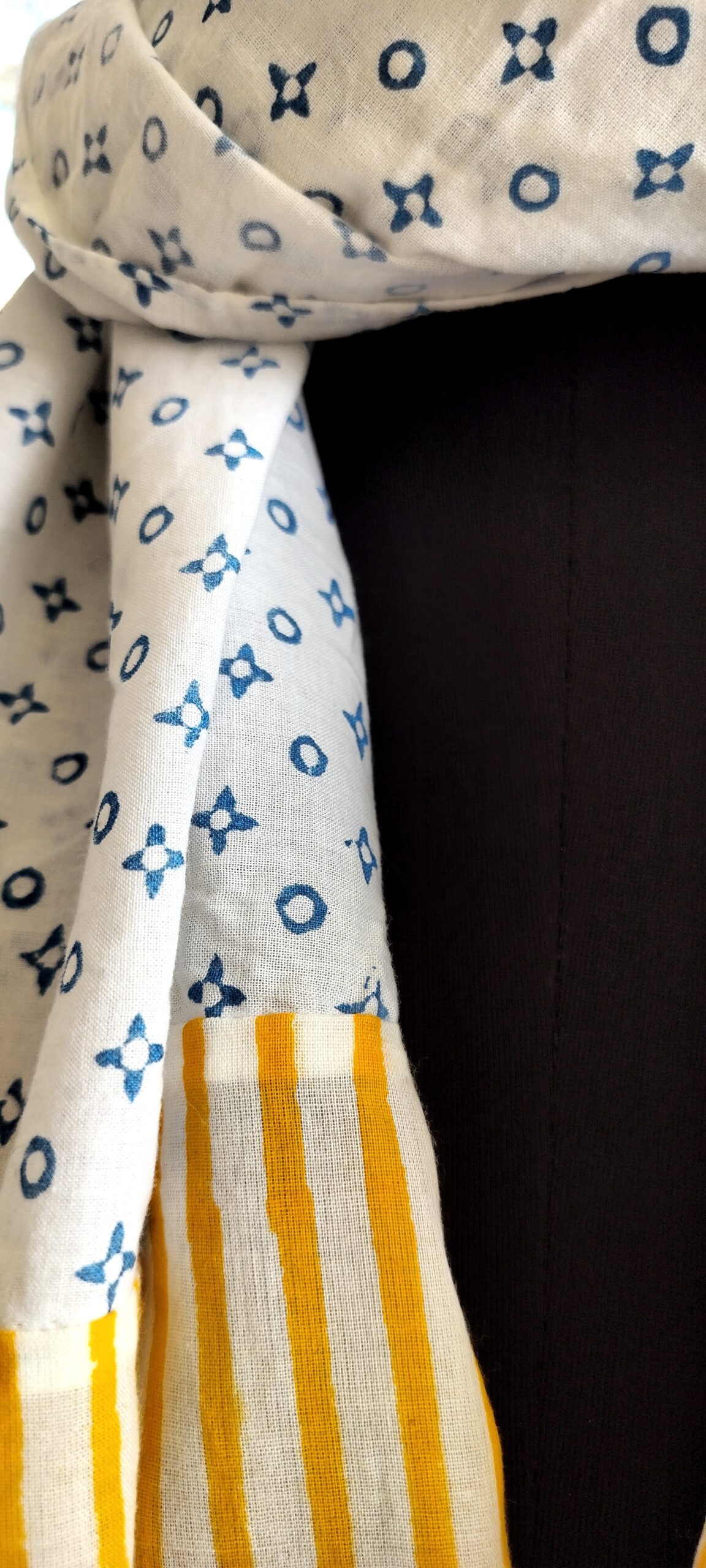 This cotton scarf features a beautiful block print design and wool pom poms. The lightweight fabric is perfect for all seasons, providing both style and comfort. Made with high-quality materials and expert craftsmanship.